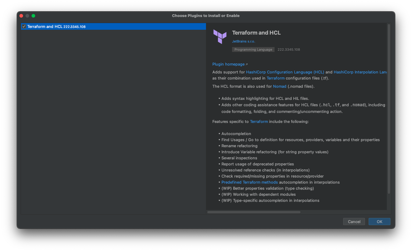 Install Terraform and HCL Plugin 을 클릭하면 자동으로 Plugins 페이지가 열리며, OK를 클릭하면 플러그인이 설치된다.