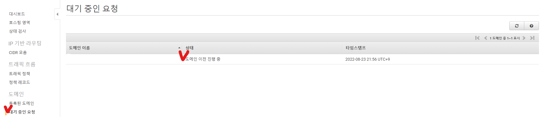 [도메인] - [대기 중인 요청] 목록에 우리가 방금 신청한 도메인 이전 대상 도메인이 있고, [도메인 이전 진행 중] 상태임을 알 수 있다.