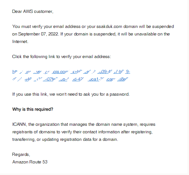 그러면 다음과 같이 기존 도메인 등록 기관에서 도메인 인증코드가 도착한다. 이 값을 잠시 후 등장하는 Route53 의 도메인 이전 기능에서 입력하면 된다.
