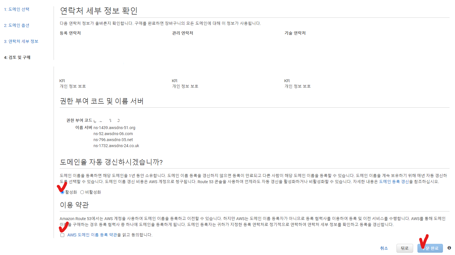 [4: 검토 및 구매] 섹션에서는 작성한 연락처와 도메인 정보를 확인한다.