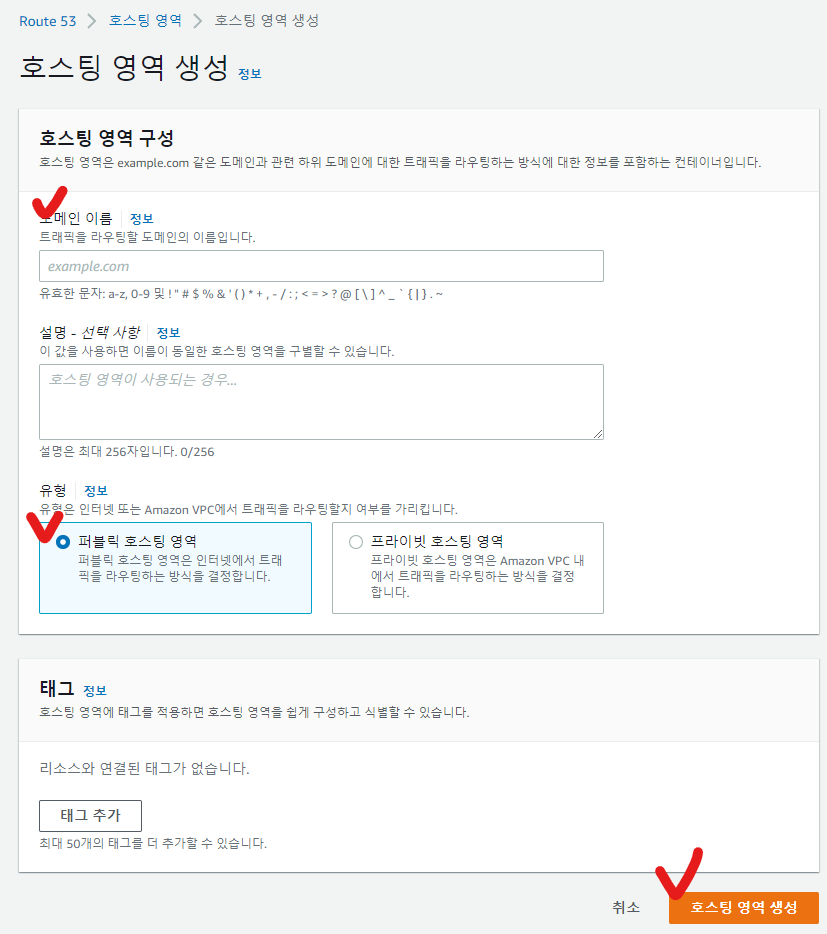 강조된 정보를 입력한 후 [호스팅 영역 생성] 을 클릭한다.