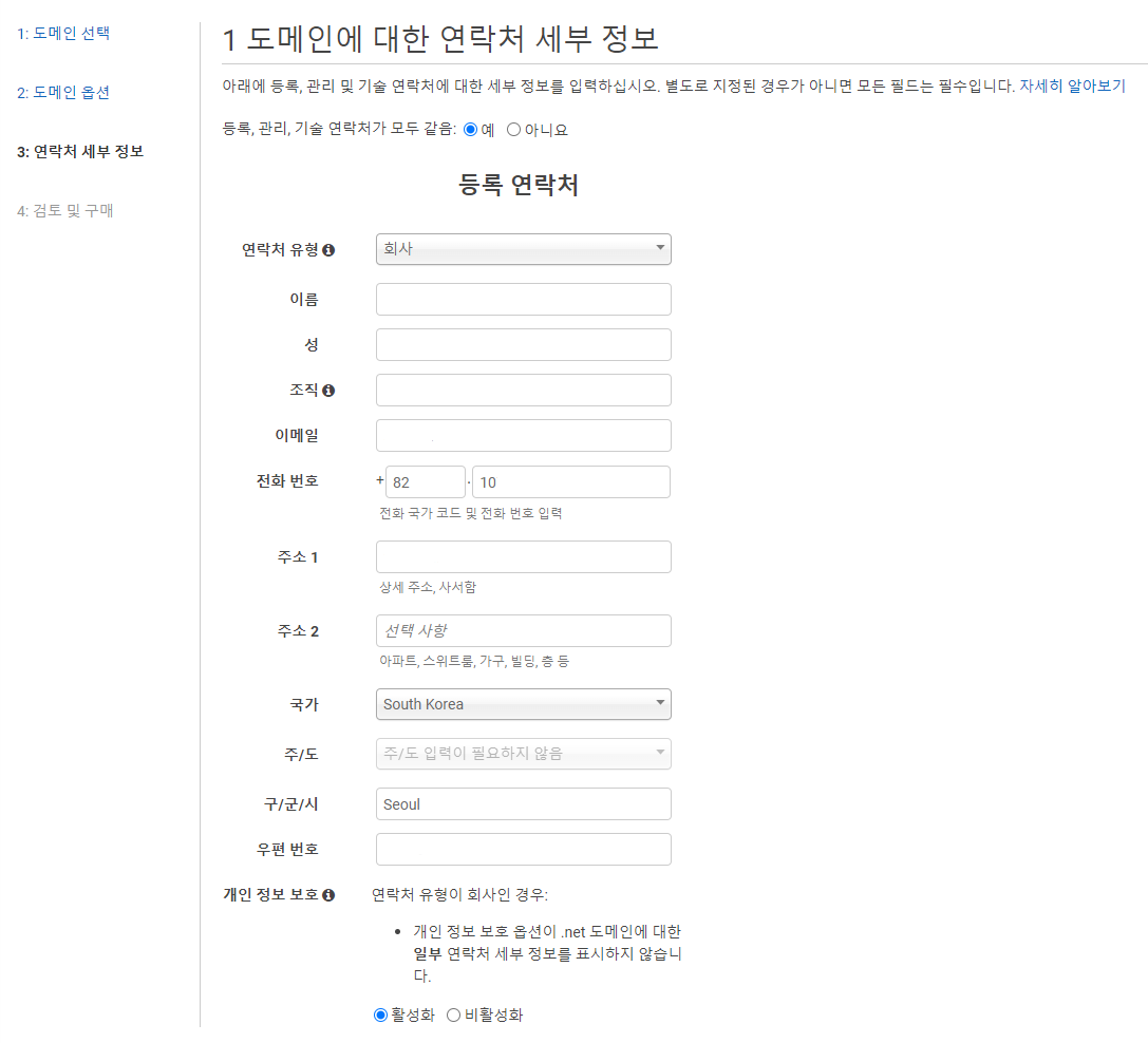 [3: 연락처 세부 정보] 섹션에서는 AWS Route53 에 등록된 해당 도메인의 소유자 정보를 입력한다.