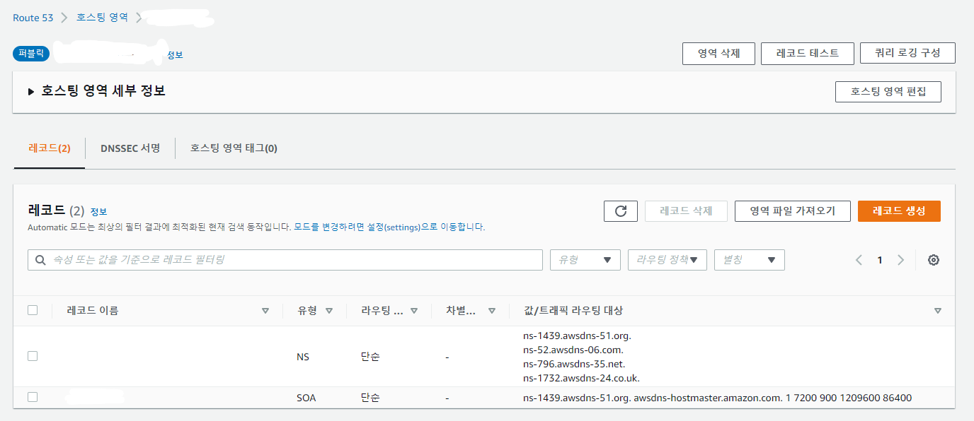새로운 호스팅 영역이 생성되고, 레코드 2개가 자동으로 붙을 것이다.