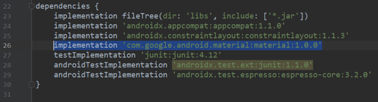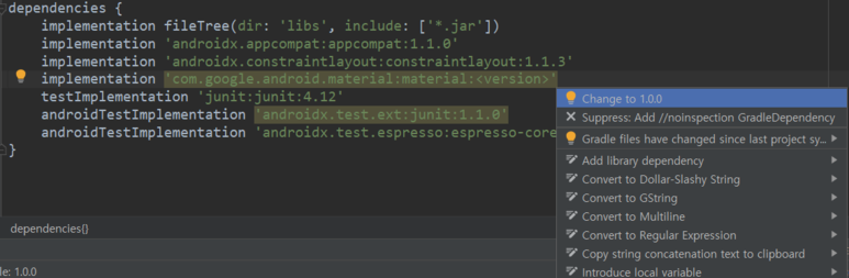 Google의 Android Material 라이브러리 항목을 dependencies 항목 내에 implementation으로 추가한다.