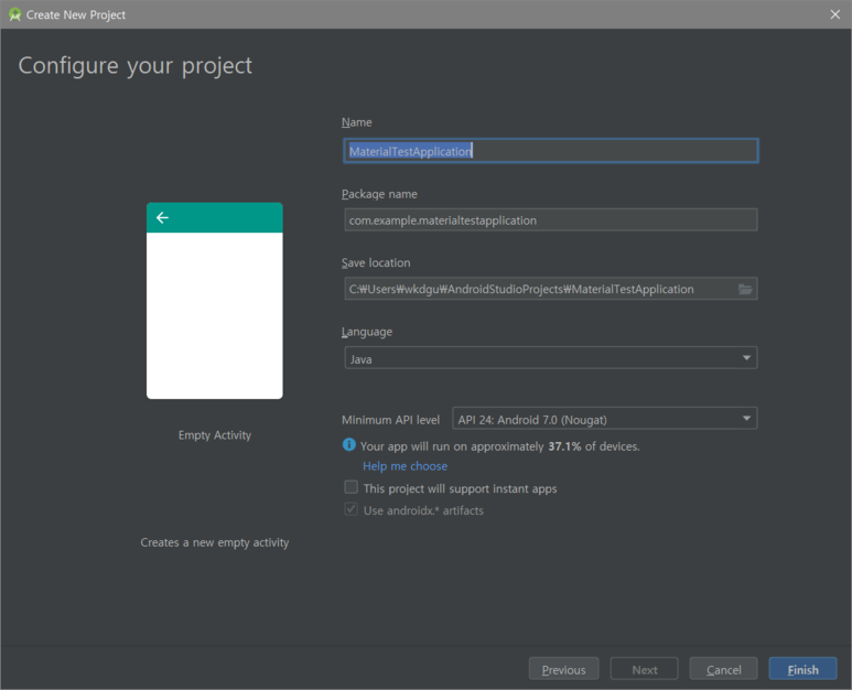 임의의 프로젝트명을 정하고 프로젝트를 생성한다. 패키지명, API Level 지원과 같은 사항은 본 포스트에서 다루지 않는다.