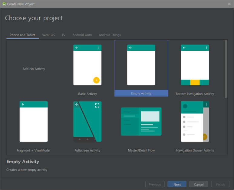 Empty Activity를 선택한다. 본 화면은 Android Studio 버전에 따라 다를 수 있다.