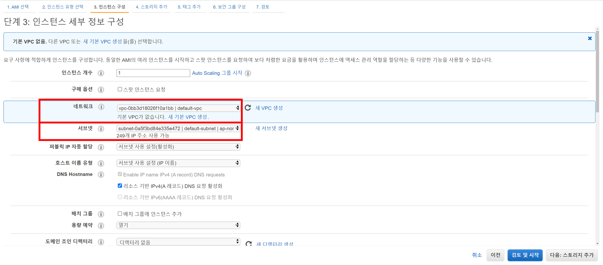 여러 가지가 많지만, 테스트 환경을 구성하기 위해서는 네트워크와 서브넷만 기본 서브넷을 선택하고 다음을 클릭한다.