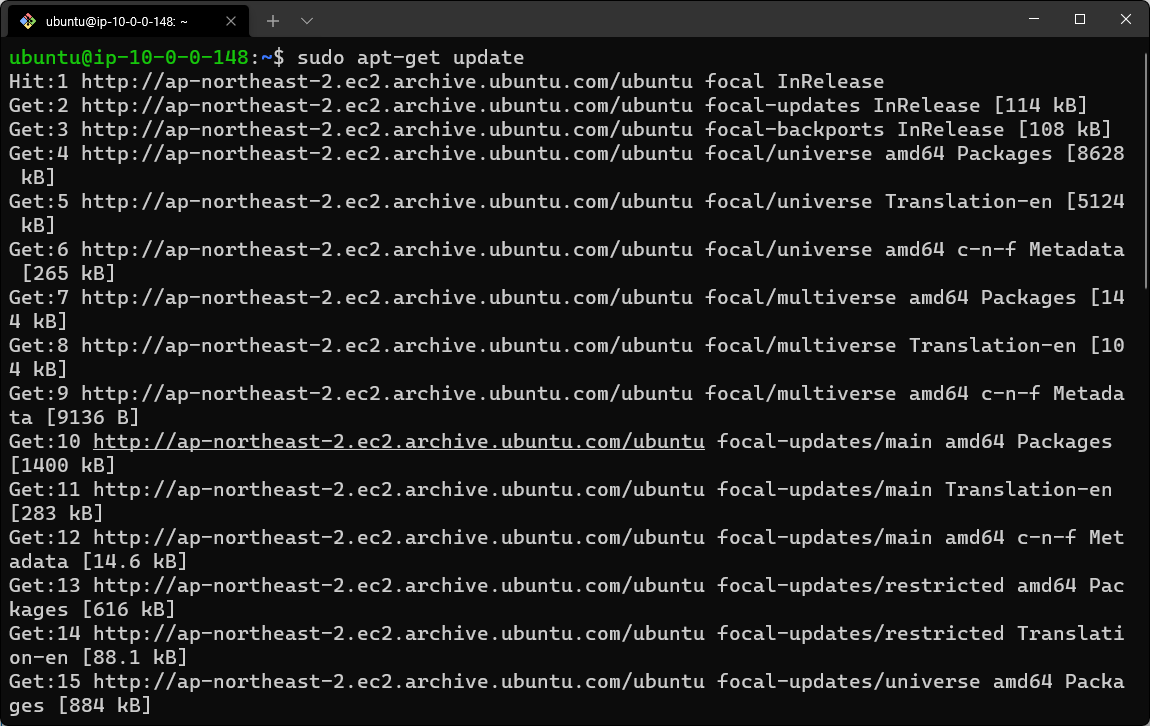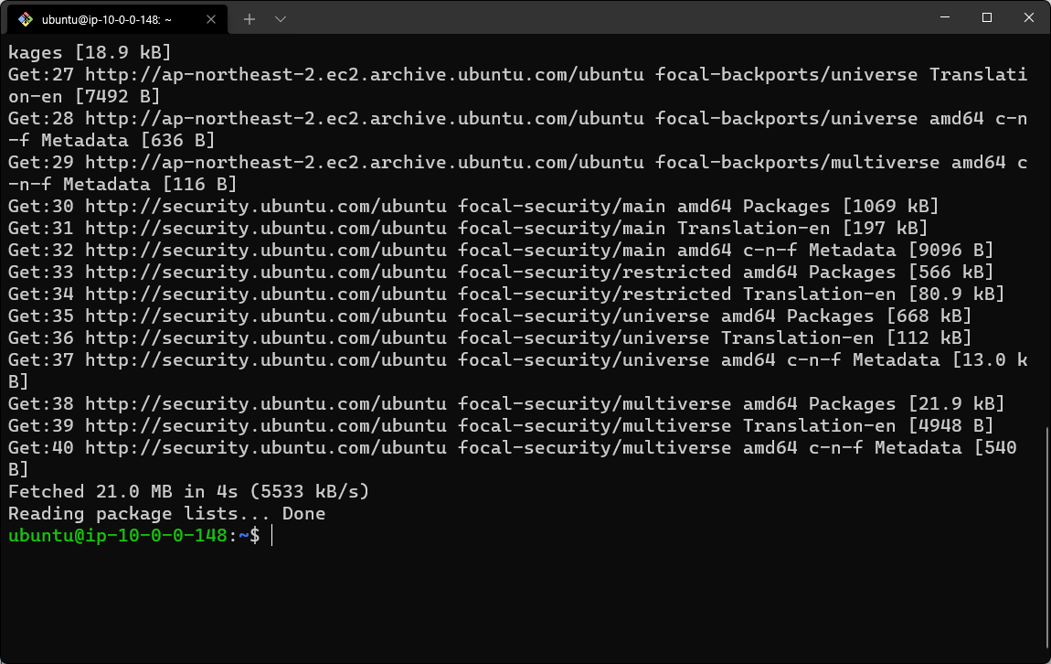 맨 아래에 보면 ubuntu 사용자로 변경됨에 의해 정상적으로 ec2 환경으로 접속됨을 확인할 수 있다.