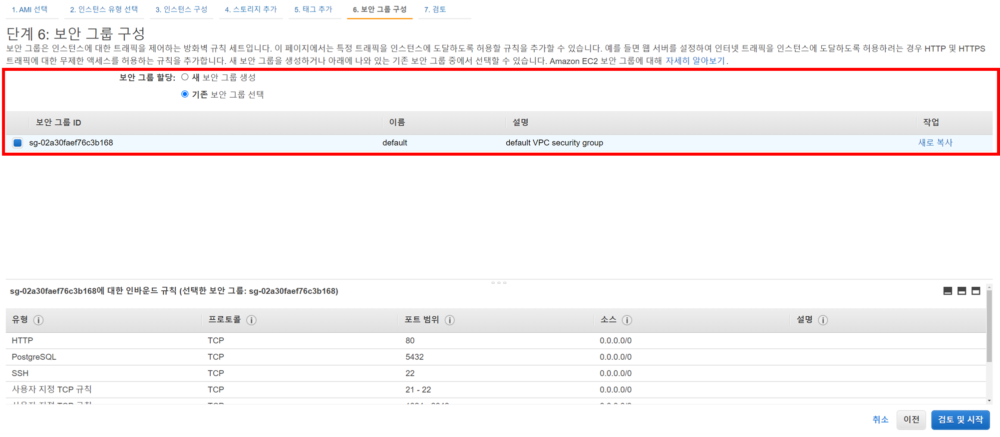 지금까지 설정한 모든 설정 값들을 모아서 보여주고, 최종 결정을 하는 단계이다. 만약 상단에 다음과 같은 경고가 발생한다면, 이는 테스트 용도로 일단 전 세계에 개방되도록 설정한 값이어서 무시하여도 된다. 물론 실무에서는 보안 그룹을 꼼꼼이 검토하여 보안에 철저한 검토를 거쳐야 한다.