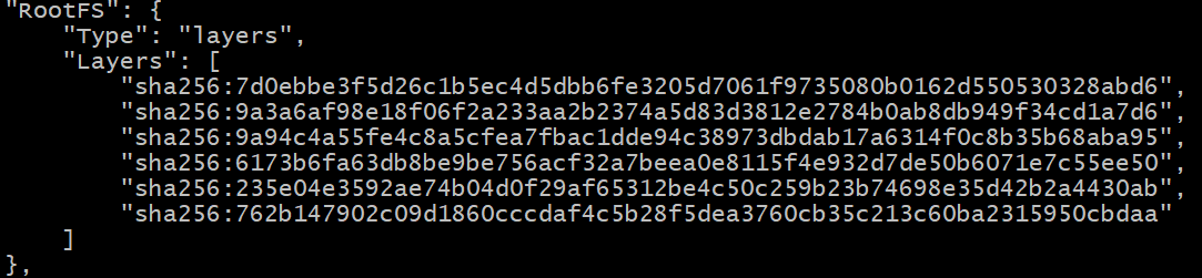 결과로 json 형식의 텍스트가 출력되는데, 이중 최하단의 "RootFS" 의 Layers 를 보면, 다음과 같이 여러 레이어로 구성된 것을 확인할 수 있다.