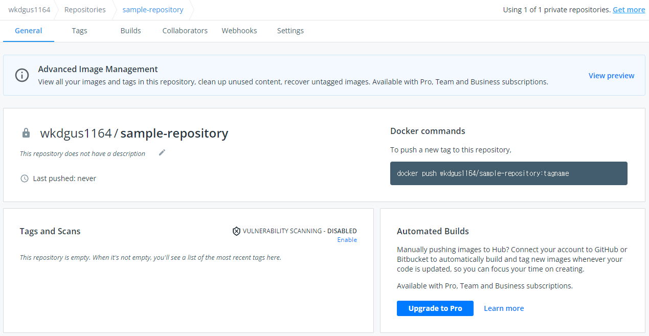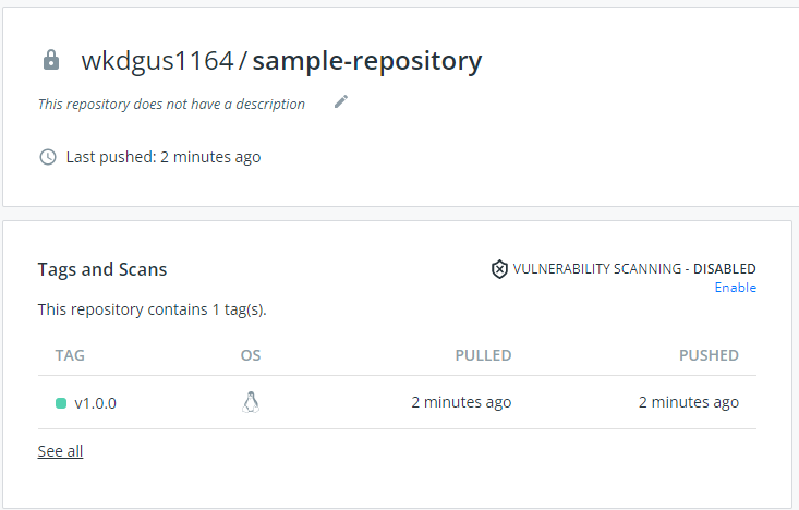 다음과 같이 Docker Hub 에 잘 업로드된 것을 확인할 수 있다.