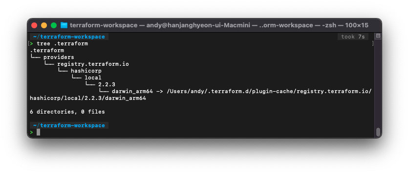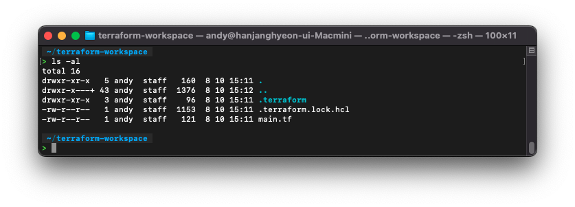 이후 디렉토리 목록을 조회해 보면 다음과 같이 .terraform 이라는 디렉토리가 생성된다.