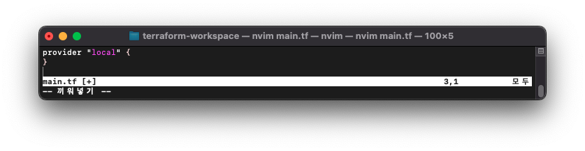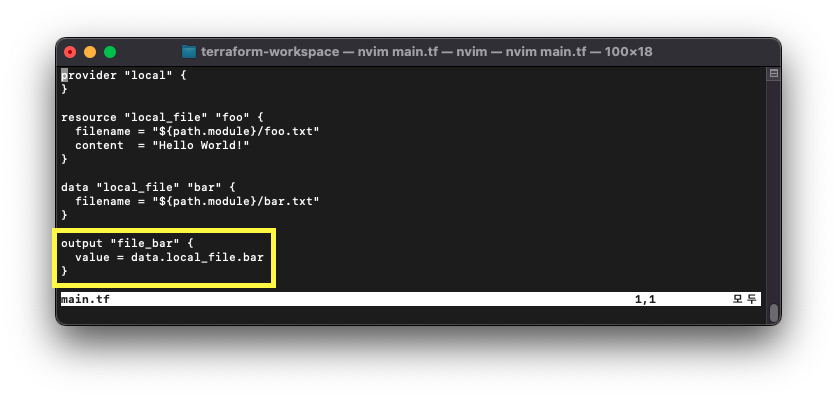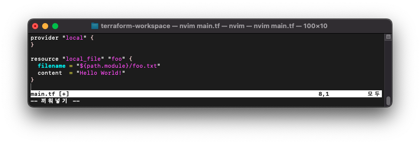 resource 지시어를 사용하여 foo 라는 local_file 을 생성하는 것을 확인할 수 있다. 이 코드를 tf 파일에 복사하고, 다음과 같이 작성해 보자.