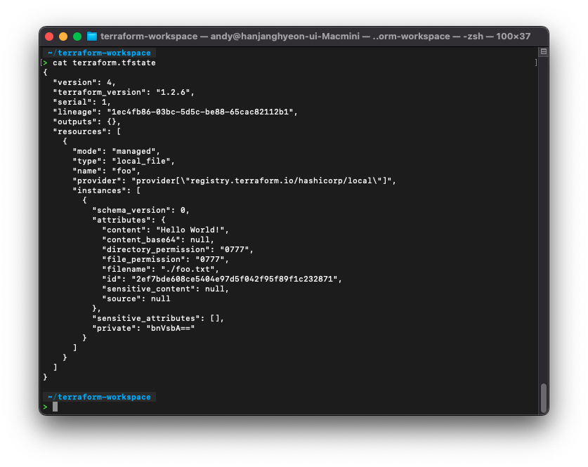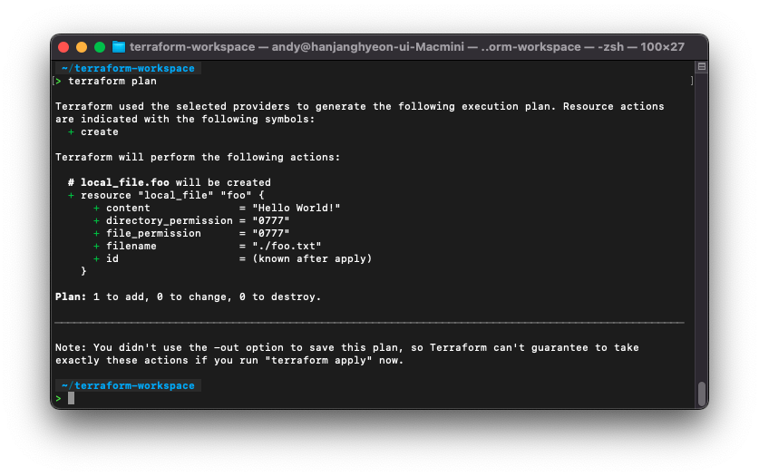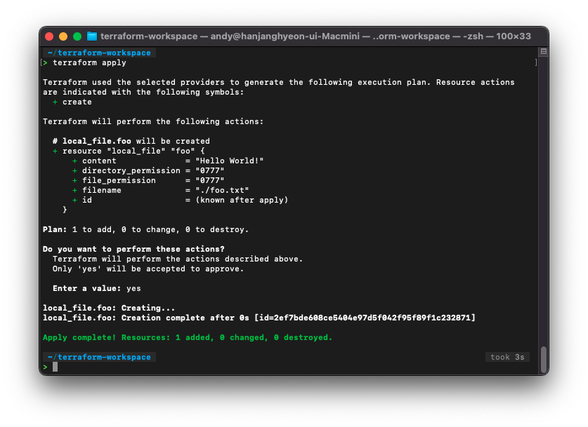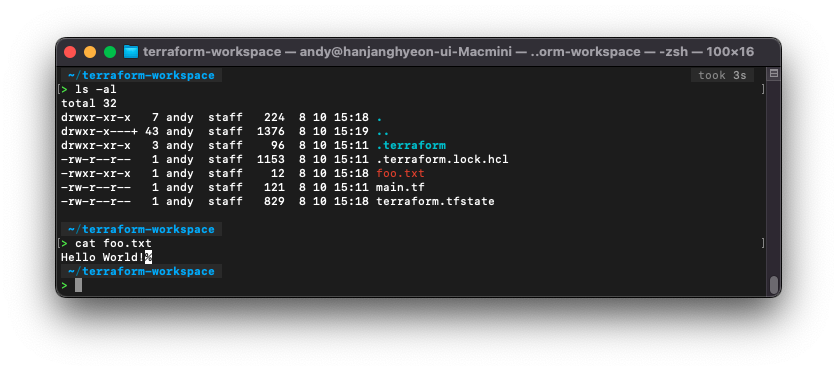 path.module 은 해당 파일이 위치한 디렉토리 경로를 의미한다. 그래서 main.tf 파일이 위치한 디렉토리에 foo.txt 파일에 "Hello World!" 라는 텍스트를 가지고 생성을 한다는 의미이다.
