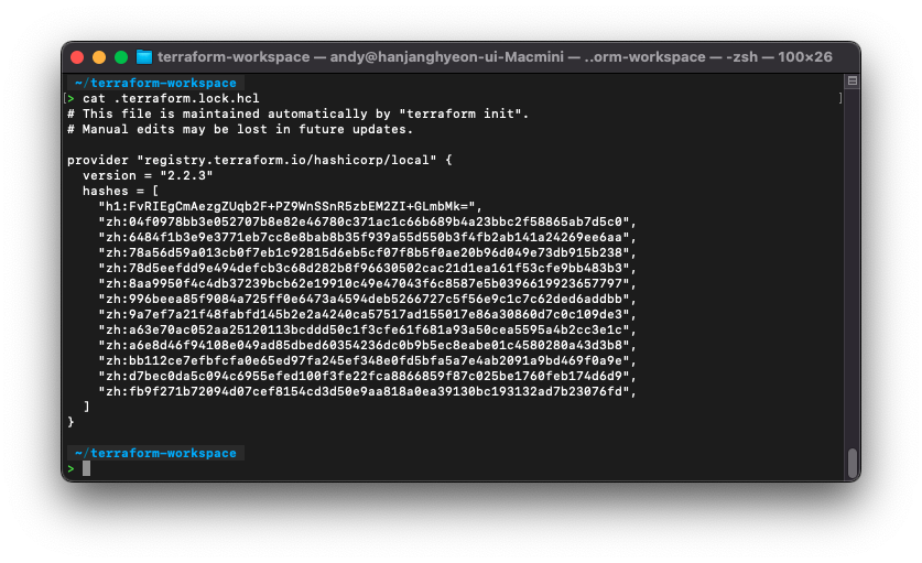 또한 .terraform.lock.hcl 파일은 팀에서 협업을 하거나 CI/CD 파이프라인을 구성하기 위해 필요한 파일이다. 해당 프로바이더의 해시섬을 체크하고 버전을 락킹시켜 각 작업자들이 동일한 환경에서 동일한 코드를 apply 하기 위해 사용한다.