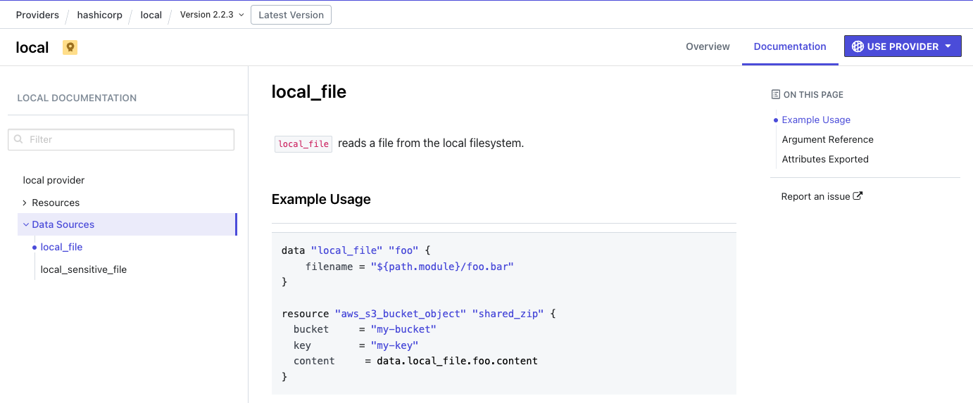 Local Provider 를 사용하도록 설정했고, 옆의 사이드바를 보면 Resources 와 Data Sources 로 나누어지는데, Resource 는 Local Provider 를 사용하여 관리할 수 있는 리소스를 의미하며, Data Sources 는 인프라 리소스를 관리할 때 데이터를 참조하여 관리할 때 사용하는 데이터 소스를 의미한다. Data Sources 는 데이터를 읽는 용도이며, Resources 는 데이터를 쓰기 위한 용도 (새로운 리소스를 만들기 위한 용도) 라고 이해하면 된다.