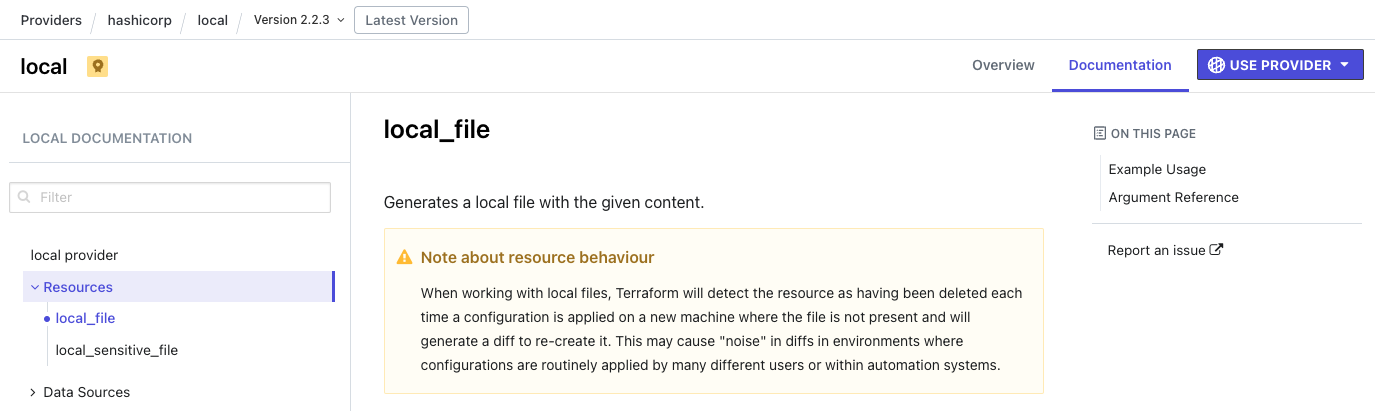 이제 Resources > local_file 에 접속해 보자. local_file 은 주어진 컨텐츠를 기반으로 로컬 파일 시스템에 파일을 생성하는 리소스이다. Example Usage 에 local_file 을 활용하는 방법이 나와 있다.