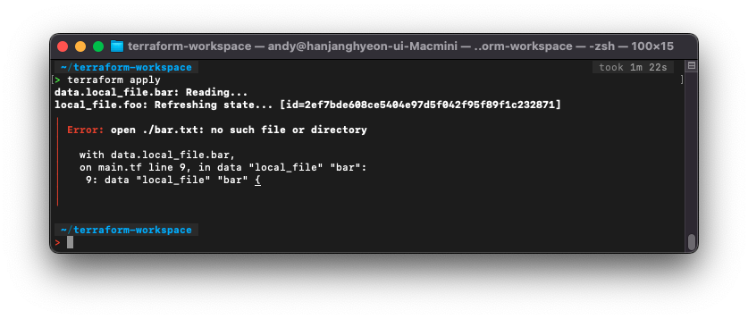 terraform apply 를 해 보면, 다음과 같이 bar.txt 파일이 없어 오류가 발생하는 것을 확인할 수 있다.