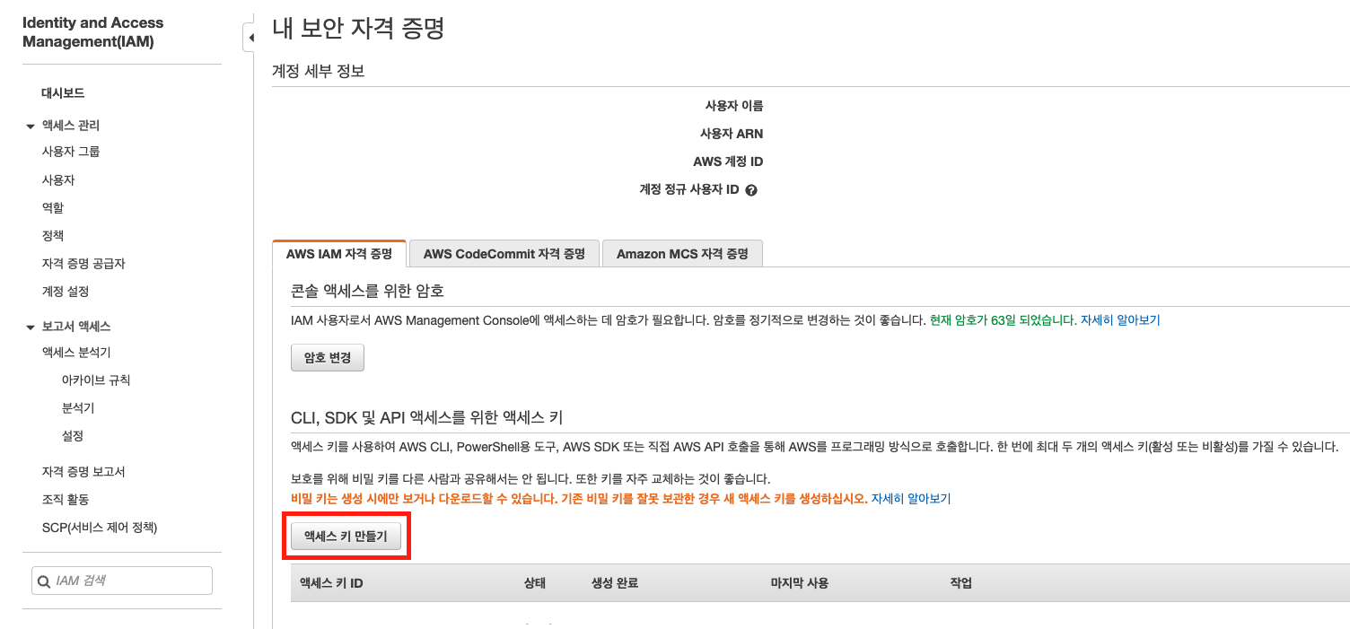 보안 자격 증명 페이지에서 AWS IAM 자격 증명 탭의 액세스 키 만들기 버튼을 클릭한다.