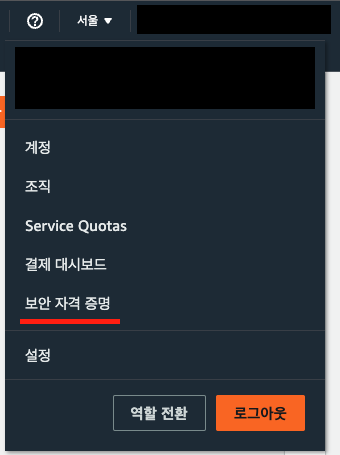 우선 AWS Console 에 본인 계정에 로그인한 후, 보안 자격 증명 메뉴로 진입한다.