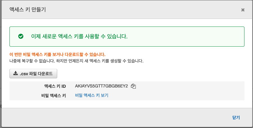 액세스 키 만들기 버튼을 클릭하면 잠시 후 새로운 액세스 키가 생성되어 관련 정보를 다음과 같이 확인할 수 있다.