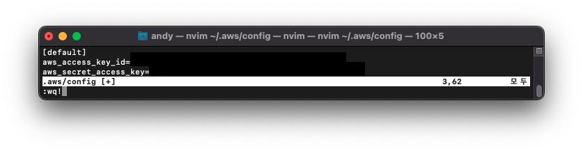 이후 해당 파일에 다음 포맷으로 액세스 키 아이디 (Access Key ID) 와 시크릿 엑세스 키 (Secret Access Key) 를 작성한다.
