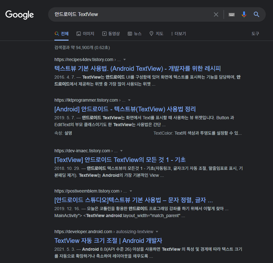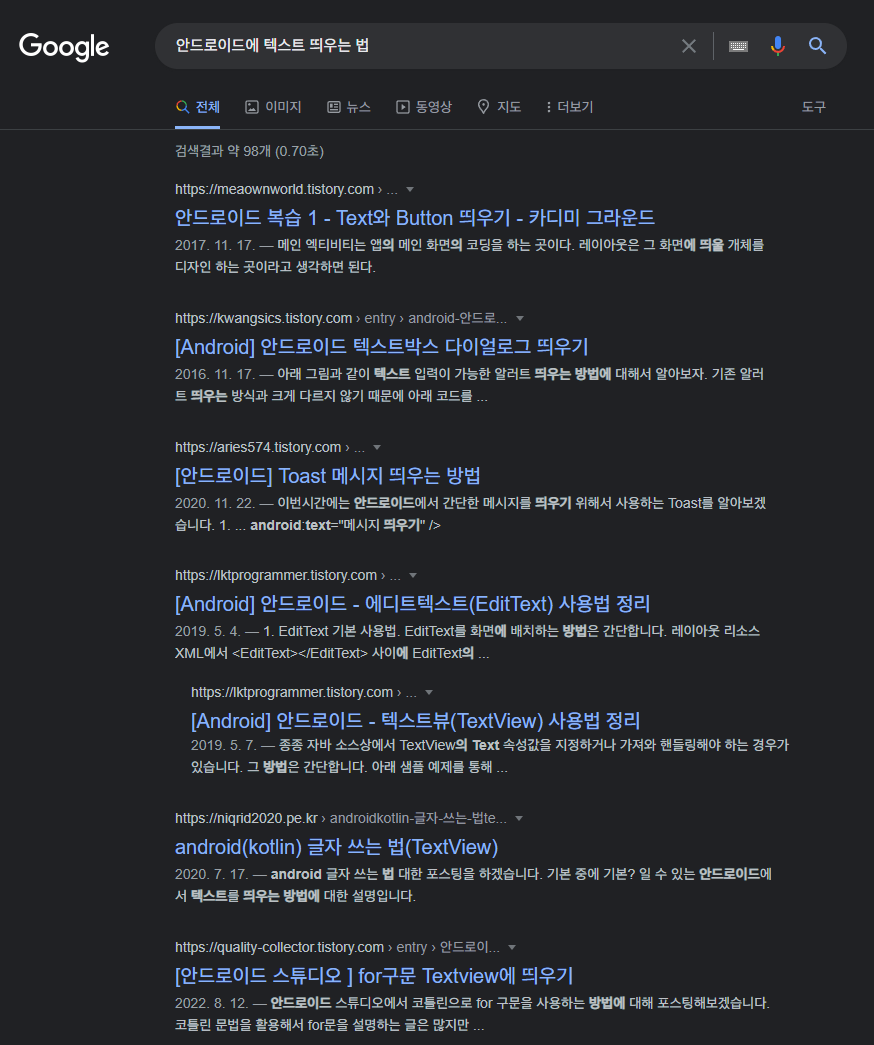 넷째, 내가 만드는 것에 적용하자. 위와 같이 검색을 통해 TextView 가 뭔지 알았다면, 이제 원래 하려던 '앱에 텍스트 띄우기' 를 할 수 있을 것이다. 그러면 우리는 벌써 TextView 가 뭔지 알았고, '안드로이드에서 화면에 텍스트를 띄우는 법' 을 알았다. 다음 목표인 리스트 만들기, 등록 화면 만들기에 대한 작업도 이와 같이 하면 된다.