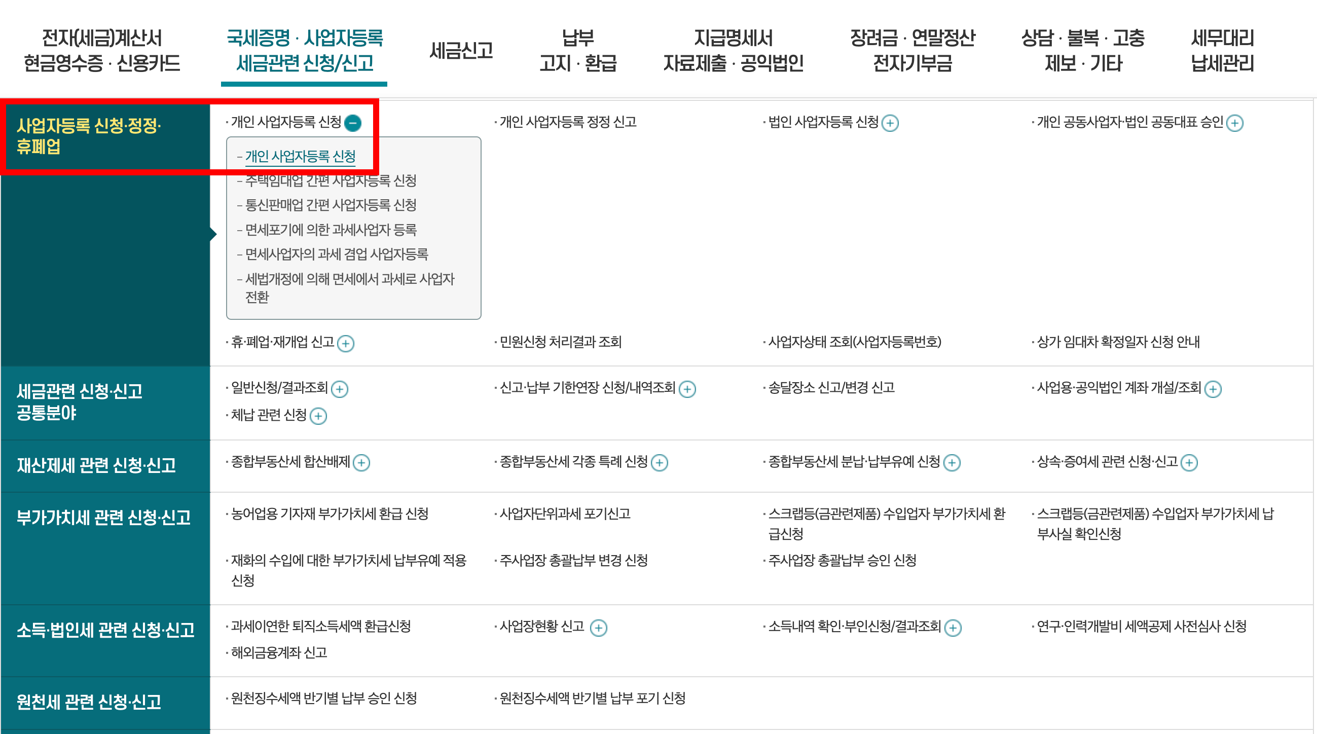2. [국세증명/사업자등록 세금관련 신청/신고] - [사업자등록 신청/정정/휴폐업] -