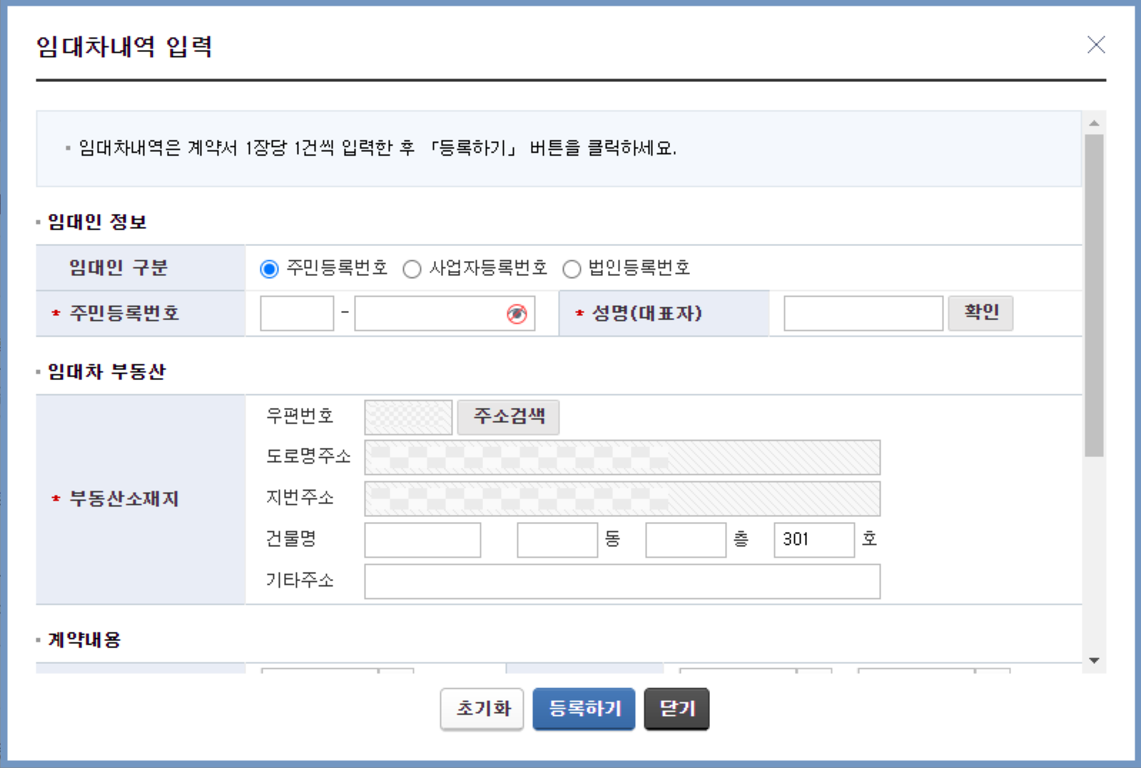 임대차계약서에 명시되어 있는 계약일자, 계약기간 등 정보를 입력하면 된다.