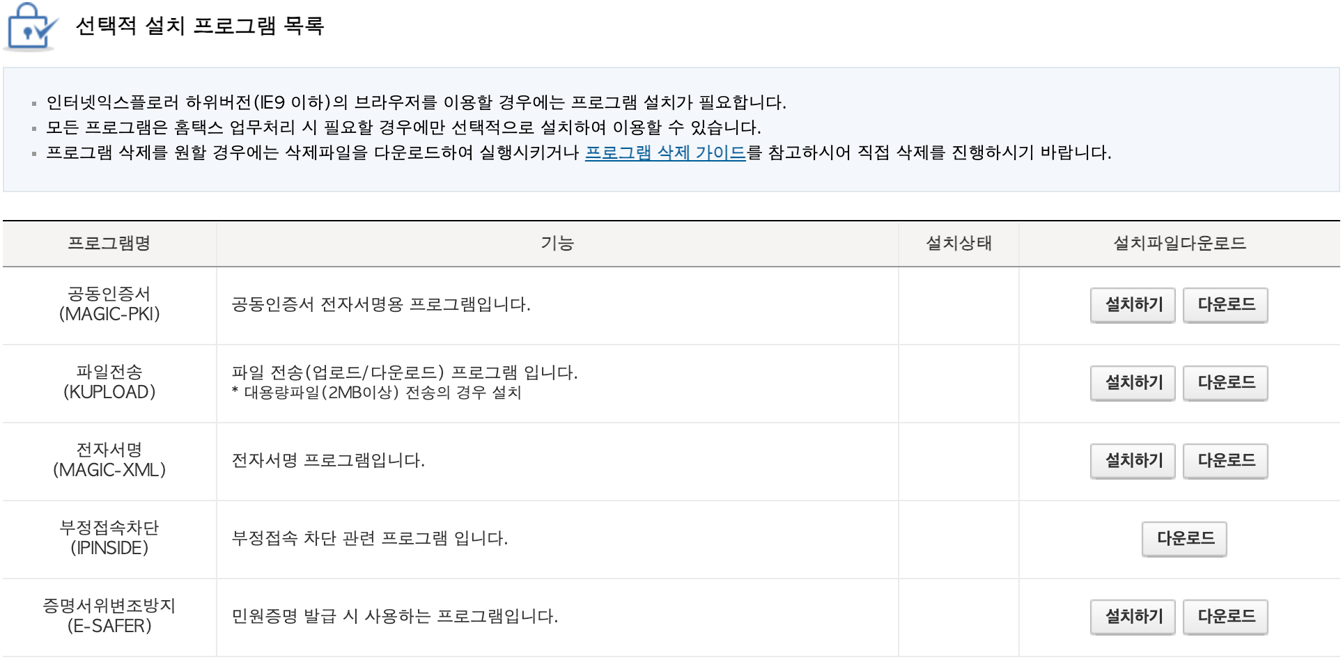 은행사이트와 마찬가지로, 국내 공공기관은 아직 보안프로그램의 늪에서 벗어나지 못했다. 사업자등록신청에 모든 프로그램들이 필요하지는 않지만, 나중에 다른 작업을 하다가 흐름이 끊기면 기분이 안 좋기 때문에 필자는 되도록이면 처음에 다 설치하고 넘어가는 편이다.