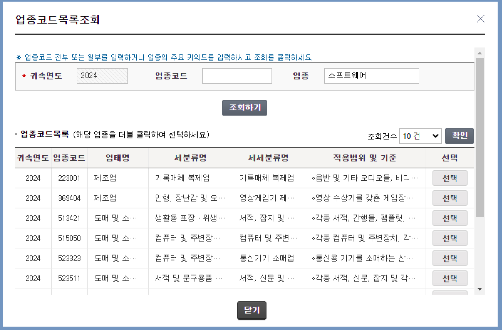 본인의 업종을 잘 모른다면, 본인이 하는 업무를 일반적으로 통용하는 용어를 검색하면 유사한 업태가 결과에 나온다. 업태와 업종은 조금 다르지만, 일단 당장은 같은 개념이라고 생각해도 된다. 그리고, 추후 변경도 가능하니 처음부터 업종코드 때문에 너무 고심할 필요는 없다.